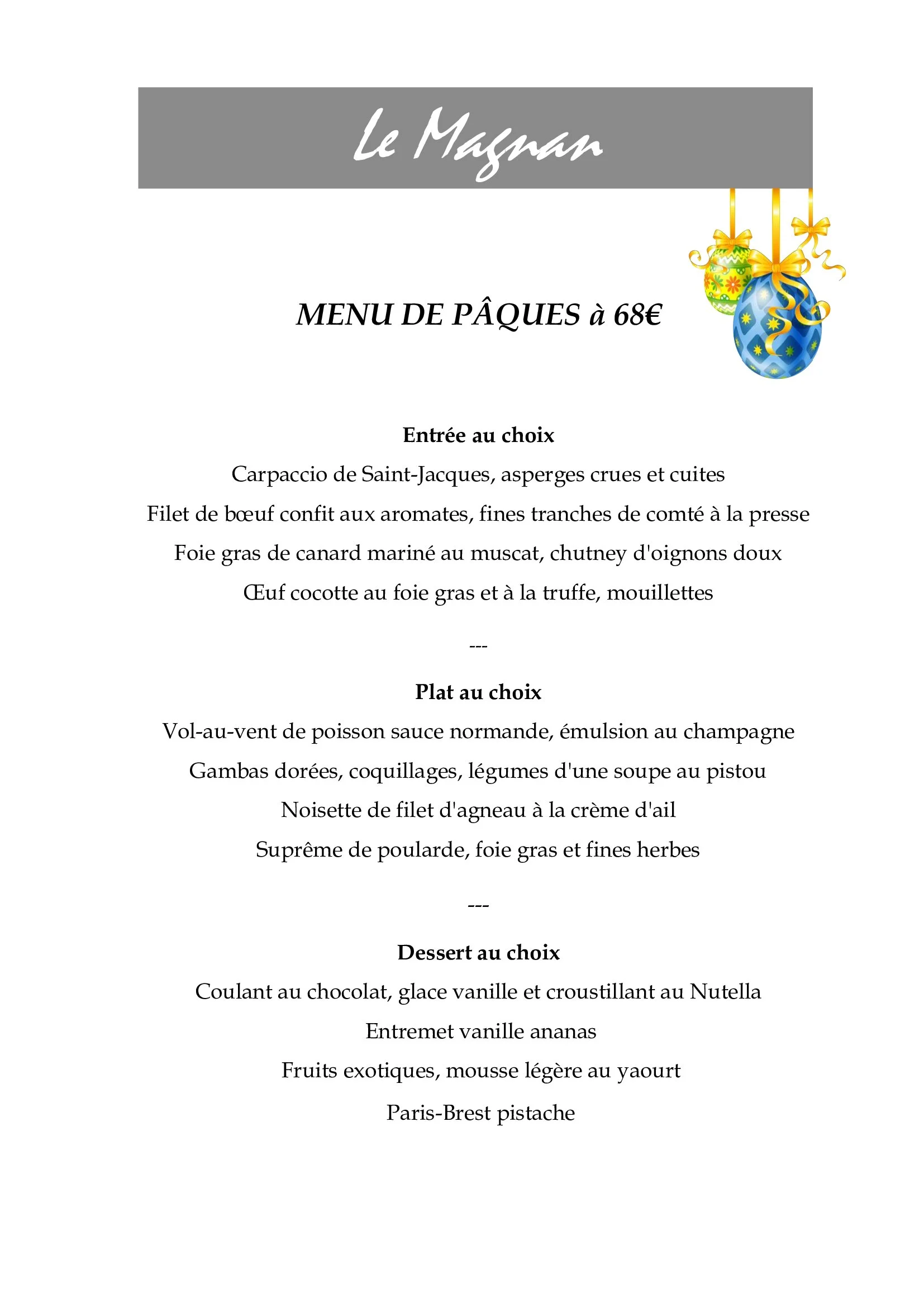 Petite chasse aux œufs pour le plaisir des enfants et pour les grands, le chef vous propose un menu spécial “Pâques” à 68€.